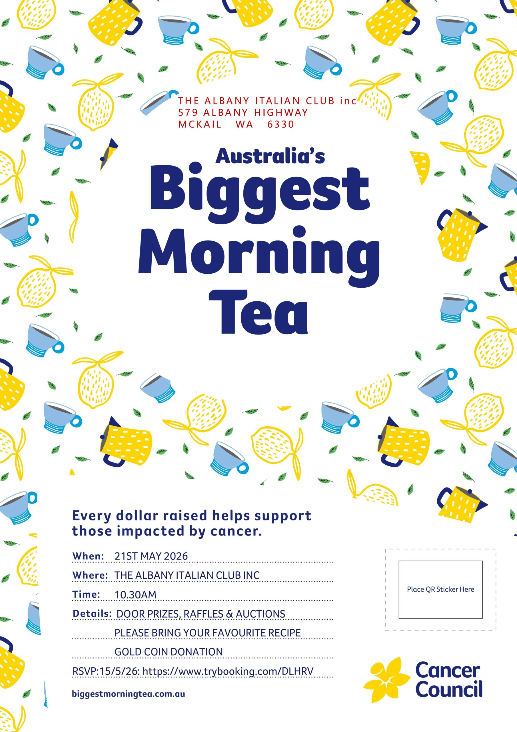 Italian Club is proudly participating in the Biggest Morning Tea for Cancer. Come along to a morning of fun and give ways. A gold coin entry only.